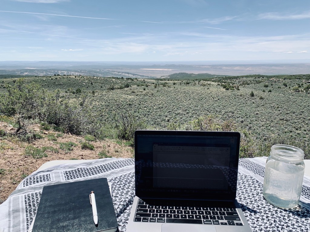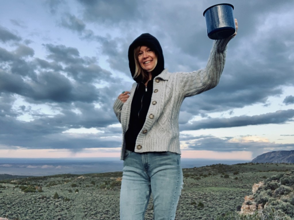 Right now, as I peer out the back window of our 14-foot home, I’m looking down at a valley. Below that are huge canyons; orange and white exposed slabs that light up when the sun hits them on its descent.