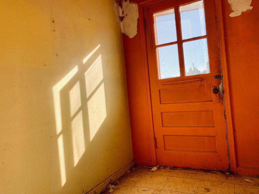 I’m in what used to be the living room. It has hard wood floors; the type people drool over these days. I tiptoe deeper inside, into a back bedroom. The floor creaks, and I shudder. The air feels heavy. The curtains – hung who knows when – are badly tattered and frayed at the bottom.