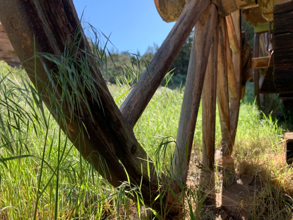 There’s a covered wagon right by the home, foxtails intermingle with the big wood wheels.