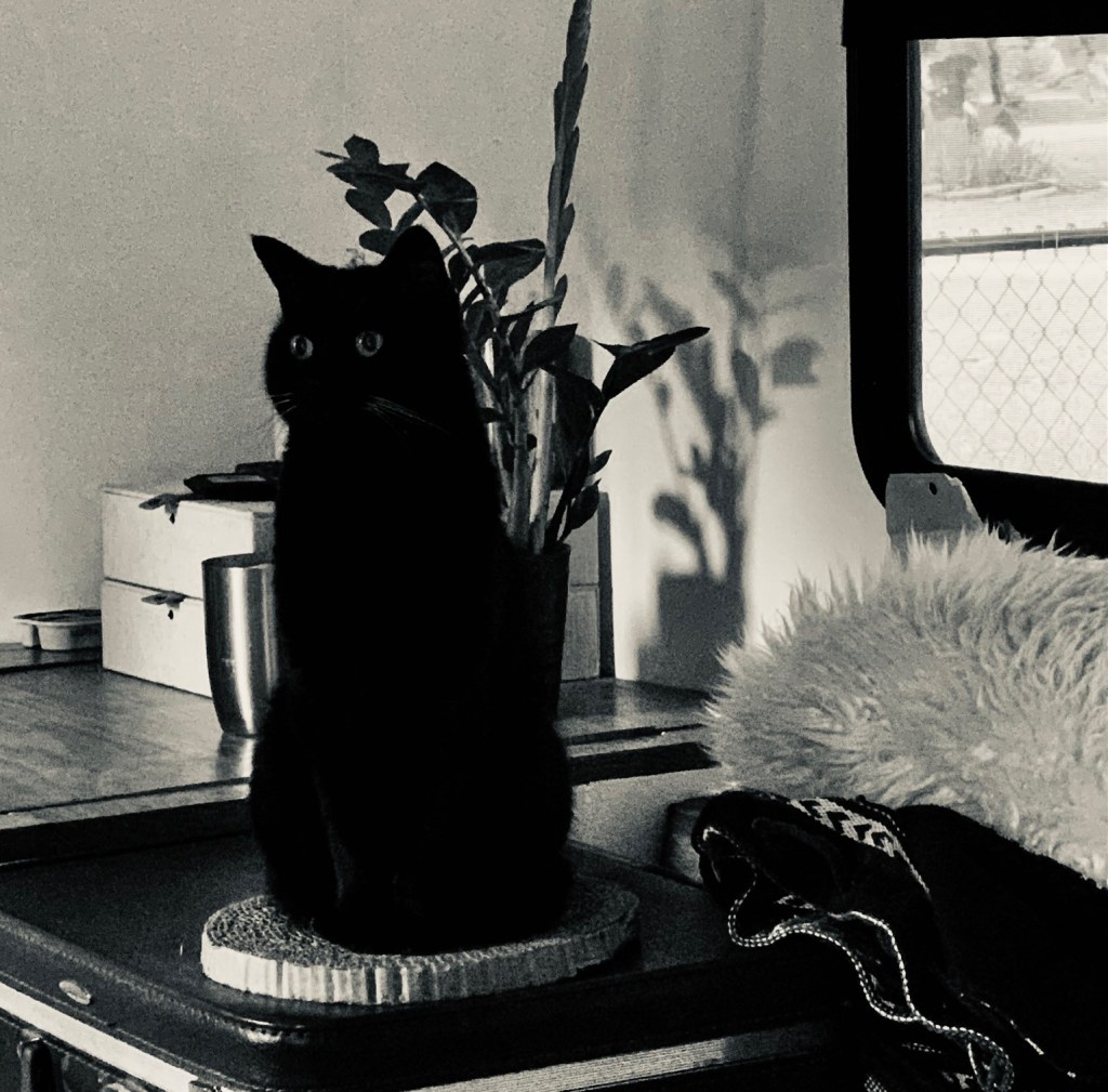 I kick my way out of the rumpled sheets and fill a tin cup with water. I drink it slowly. It’s still dark outside, save for the soft yellow porch light which filters through the window, illuminating a spot on the wood countertop.