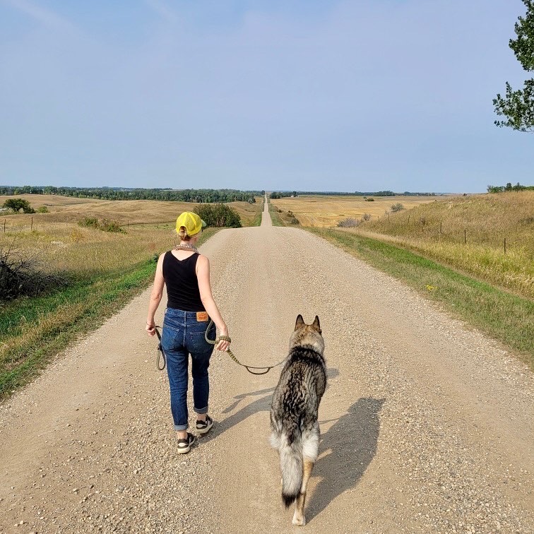 Walking Elvis down the straight roads that stretch for miles over the rolling landscape, my black Blundstone boots dusty because the path is more dirt than gravel. My jeans (real jeans, not the stretchy kind I usually wear that forgive dietary trespasses; I’m wearing cuffed Levi’s I got from the men’s rack at a thrift store in Wisconsin for $1) are collecting dust too. They’re the kind of jeans the farmers who pass by perched high on their big John Deere machines might wear. The massive tractor tires, the size of those round farm tables with the folding leaves, kick up dust and gouge big zipper patterned bites in the road.